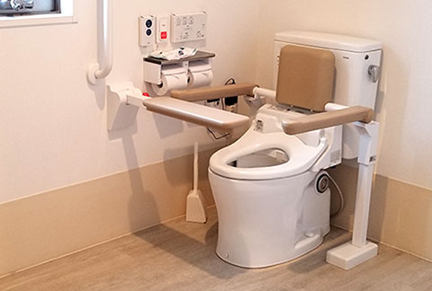 ひまわり会館蟹江今では、お手洗いが8カ所あります。車いすでもシルバーカーでも、ゆっくりと入って頂けるように広々とした設計になっております。使い勝手を配慮した、手すりや安全バーを設置しております。 -