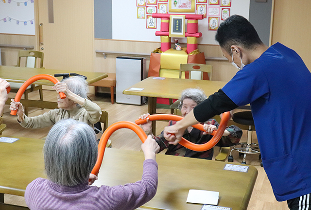リハビリ職員が常駐し、個別のリハビリだけでなく、集団リハビリを行います。いつまでも自分で出来ることは自分で行えるようサポートが出来る体制を作っています。