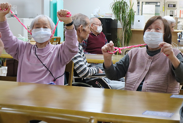 地域のボランティア団体や大学⽣にご協力いただき、定期的にレクリエーションを行ってもらっています。楽しく元気に⽣活して頂けるよう⽇々のレクリエーションや体操を行っています。 -