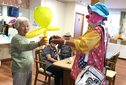 職員がピエロに変身してバルーンアートを披露するイベントでは、リクエストに応えてその場で作ったものをプレゼント! -